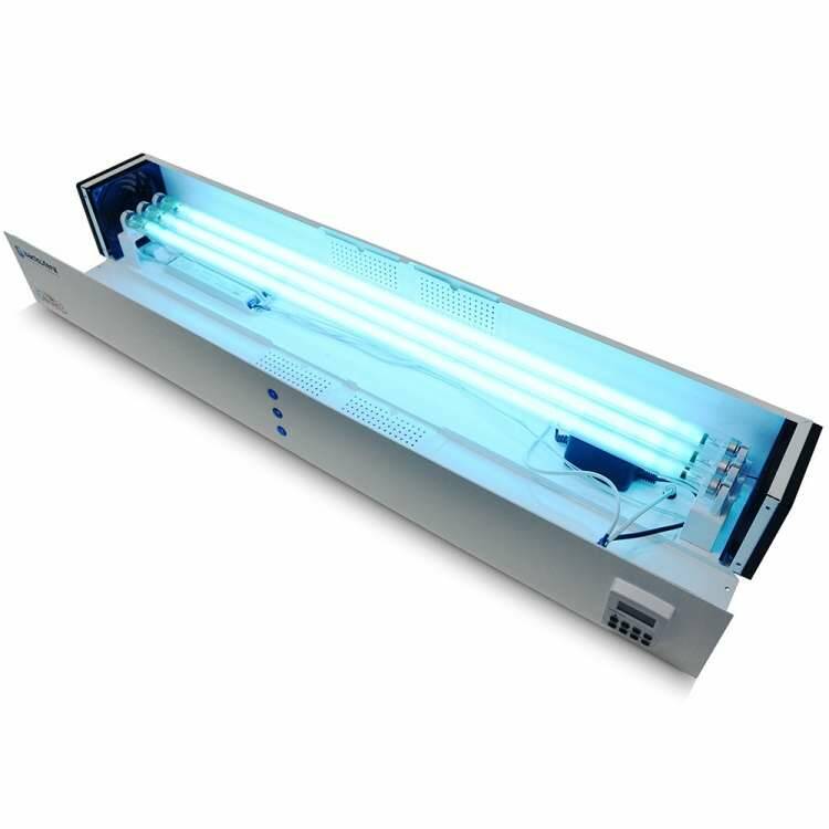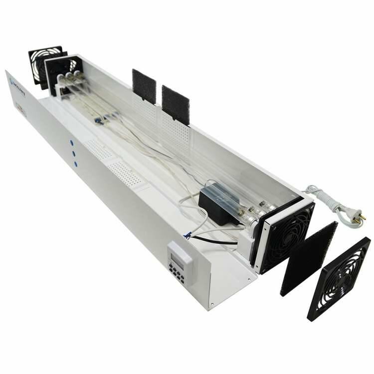 • Конструкція. В рециркуляторі встановлено два витяжних вентилятори. Крім цього на бічних стінках приладу встановлено два повітрозабірника з захистом від зовнішнього проникнення прямих УФ-С променів. Така конструкція збільшує швидкість повітропрохідності до двох разів, що сприяє більш швидкому знезараженню повітря. Усередині корпусу опромінювача на кріпильних отворах розміщені герметичні кришки для утримання тяги (швидкості руху повітря). Корпус приладу легко демонтується для  техобслуговування.