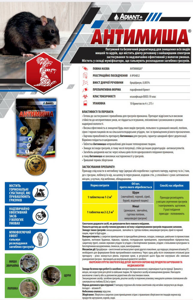 Антимыша - Мощный и безопасный родентицид для уничтожения всех видов мышей и крыс, содержащий действующее вещество с широким спектром применения и чрезвычайно эффективен во влажных условиях. Содержит в составе мумификаторы, тормозящие разложение погибших грызунов.