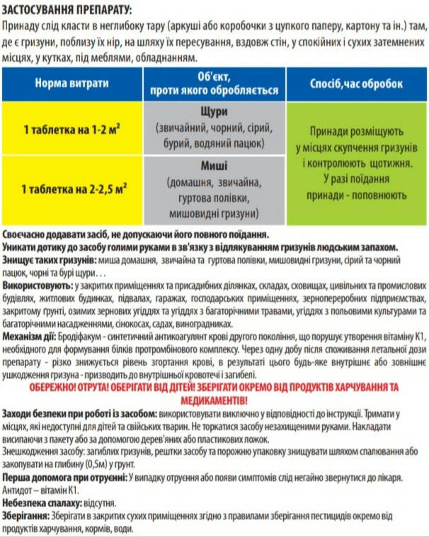 Механизм действия: Бродифакум - синтетический антикоагулянт крови второго поколения, нарушает образование витамина К1, необходимого для формирования белков протромбинового комплекса. Через одни сутки после потребления летальной дозы препарата - резко снижается уровень свертываемости крови, в результате этого любое внутреннее или внешнее повреждение грызуна - приводит к внутреннему кровотечению и гибели.