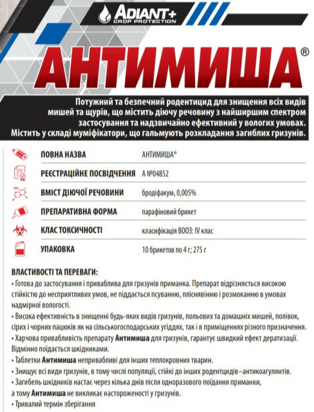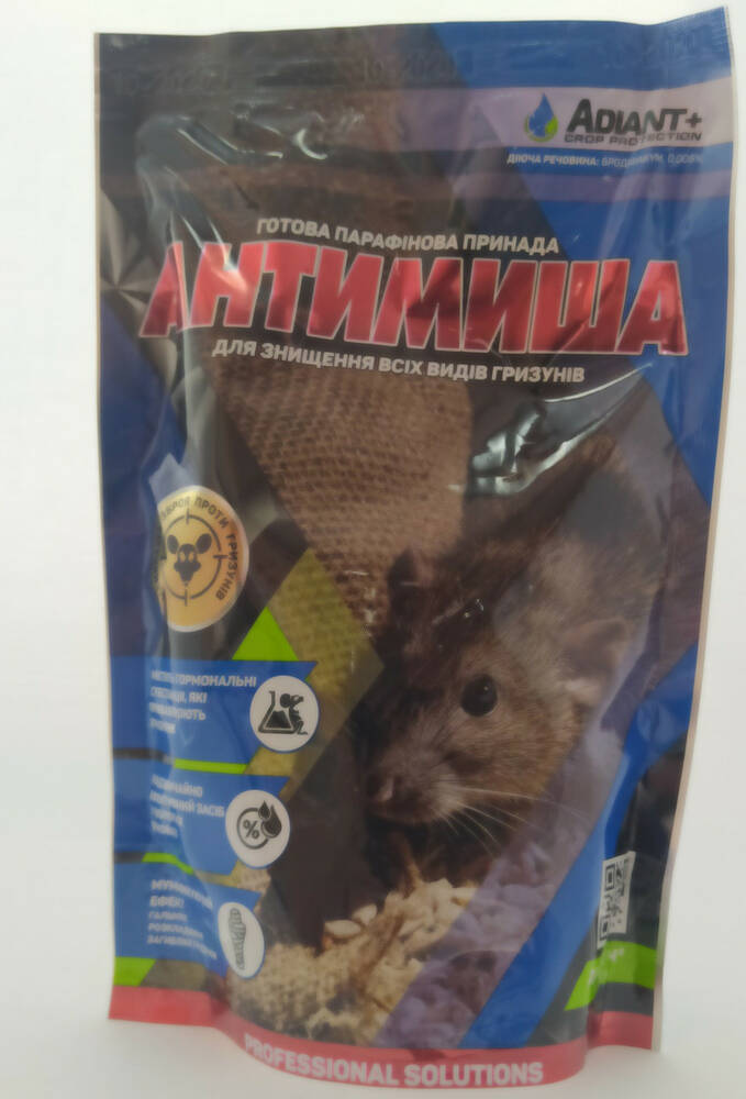 Антимыша - Мощный и безопасный родентицид для уничтожения всех видов мышей и крыс, содержащий действующее вещество с широким спектром применения и чрезвычайно эффективен во влажных условиях. Содержит в составе мумификаторы, тормозящие разложение погибших грызунов.
