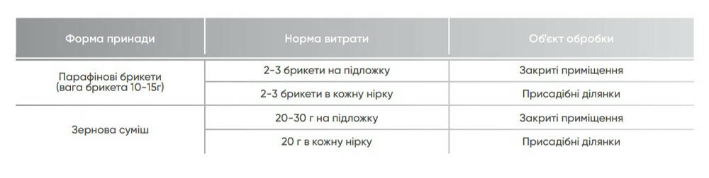 Перед применением приманки необходимо обследовать территорию и провести учет численности грызунов. На сельскохозяйственных угодьях, на приусадебных участках приманки закладывают в норы с последующей засыпкой землей. В закрытых помещениях приманки размещают в местах локализации грызунов в специальных контейнерах или на приспособленных подложках в соответствующем количестве (см. табл.) с интервалом 3-15 м. Количество закладок и проведения обработок зависит от численности грызунов. В зависимости от численности грызунов, приманка разлагается каждые 7-14 суток до момента обнаружения остатков приманки, не поедается грызунами.