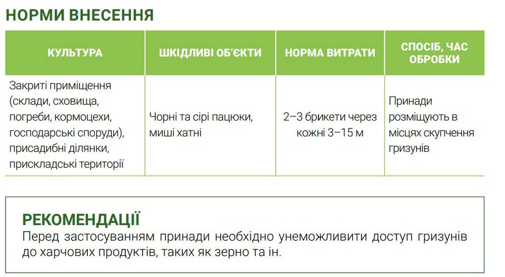 Перед применением приманки необходимо исключить доступ грызунов к пищевым продуктам, таким как зерно и др.