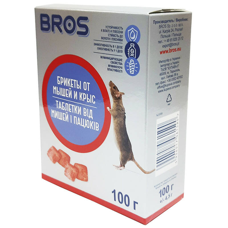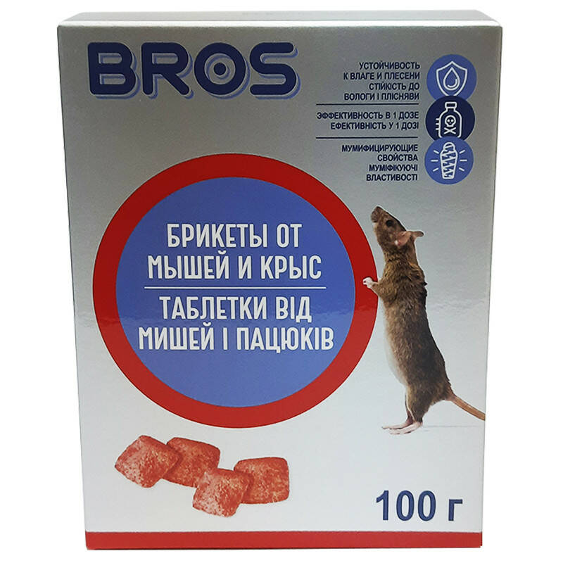 Брикети Bros від мишей і пацюків - це отруйна принада як воскові брикети, що мають особливу стійкість проти цвілі та вологи, тому рекомендується до використання на вулиці, на горищах або в підвалах. Має муміфікаційні властивості: немає неприємного запаху — гризун просто висихає. Засіб має повністю протилежну отруті дію, тому гризуни охоче його з'їдають. Речовина поступово накопичується в організмі гризуна, і вони не підозрюють, що з'їдають принаду.