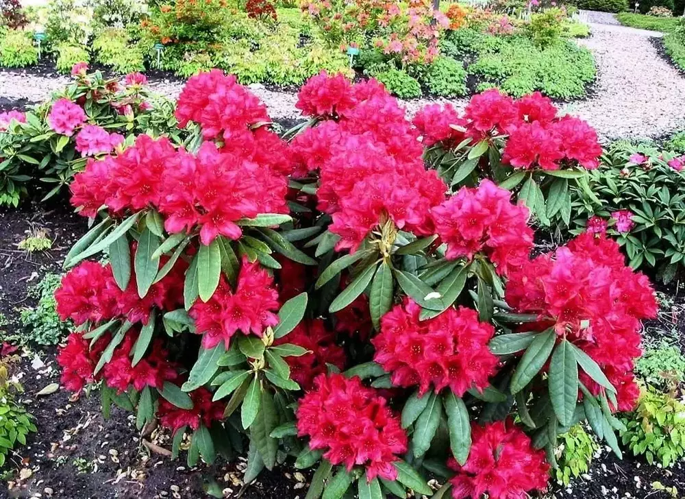 Рододендрон гібридний Нова Зембла - вічнозелений рясно квітучий чагарник, унікальний темно-зеленим листям, що створює фон для інших рослин, а в літній період захоплює погляди пишністю рубіново-червоних квітів з фіолетово-коричневим вкрапленням з золотистими пильовиками. Ця рослина стане прикрасою вашої домашньої колекції декоративних рослин.