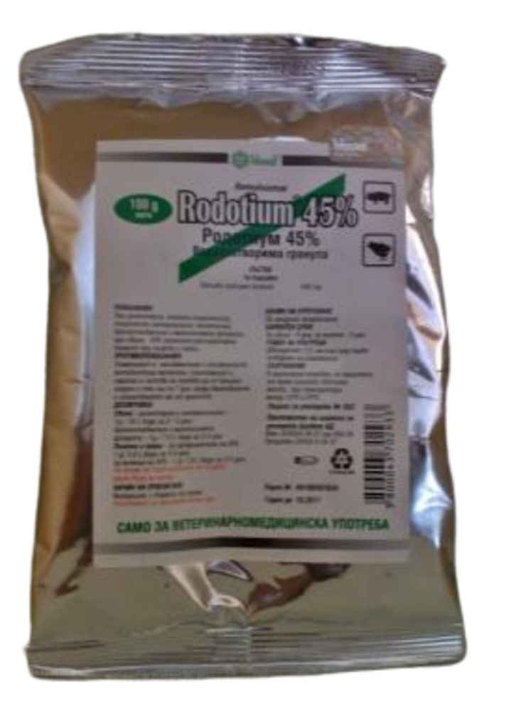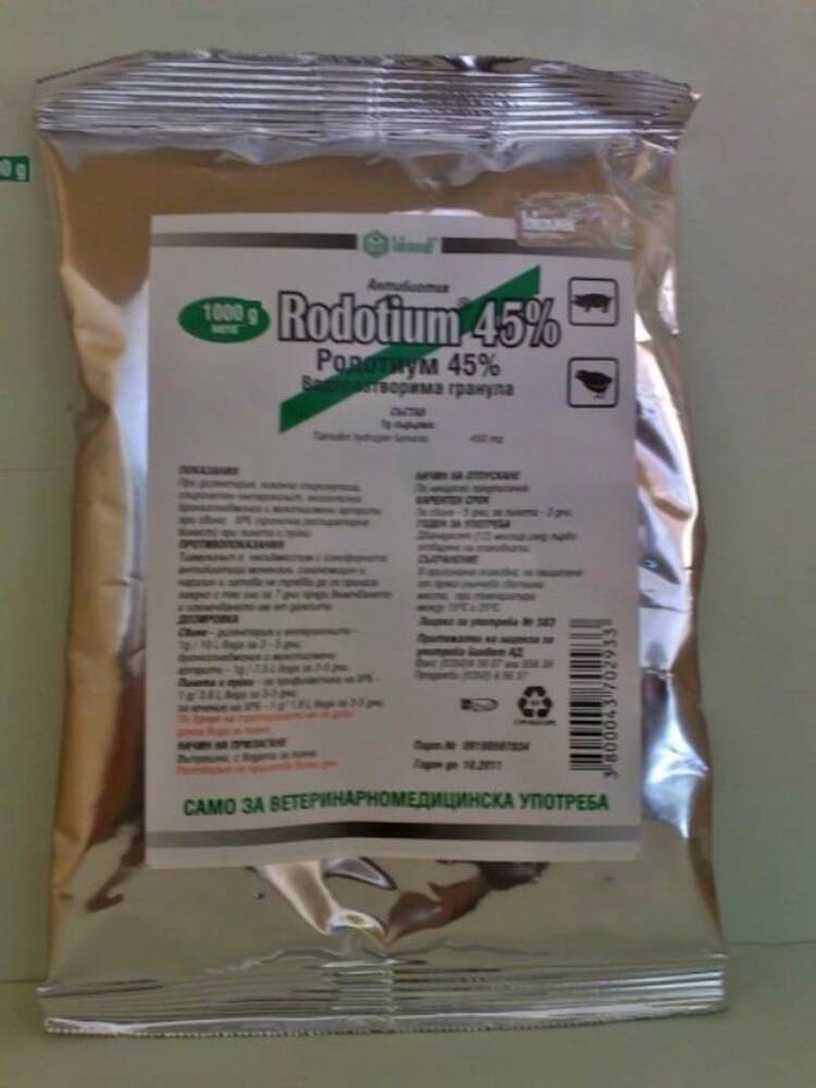 Для лікування ензоотичної пневмонії свиней Родотіум® 45% застосовують у дозі 0.033-0.045 г (15-20 мг тіамуліна) на 1 кг маси тварини. Споживання тваринами добової дози забезпечується випоюванням 0.012 - 0.018% розчину тіамуліну протягом 5-10 днів.
