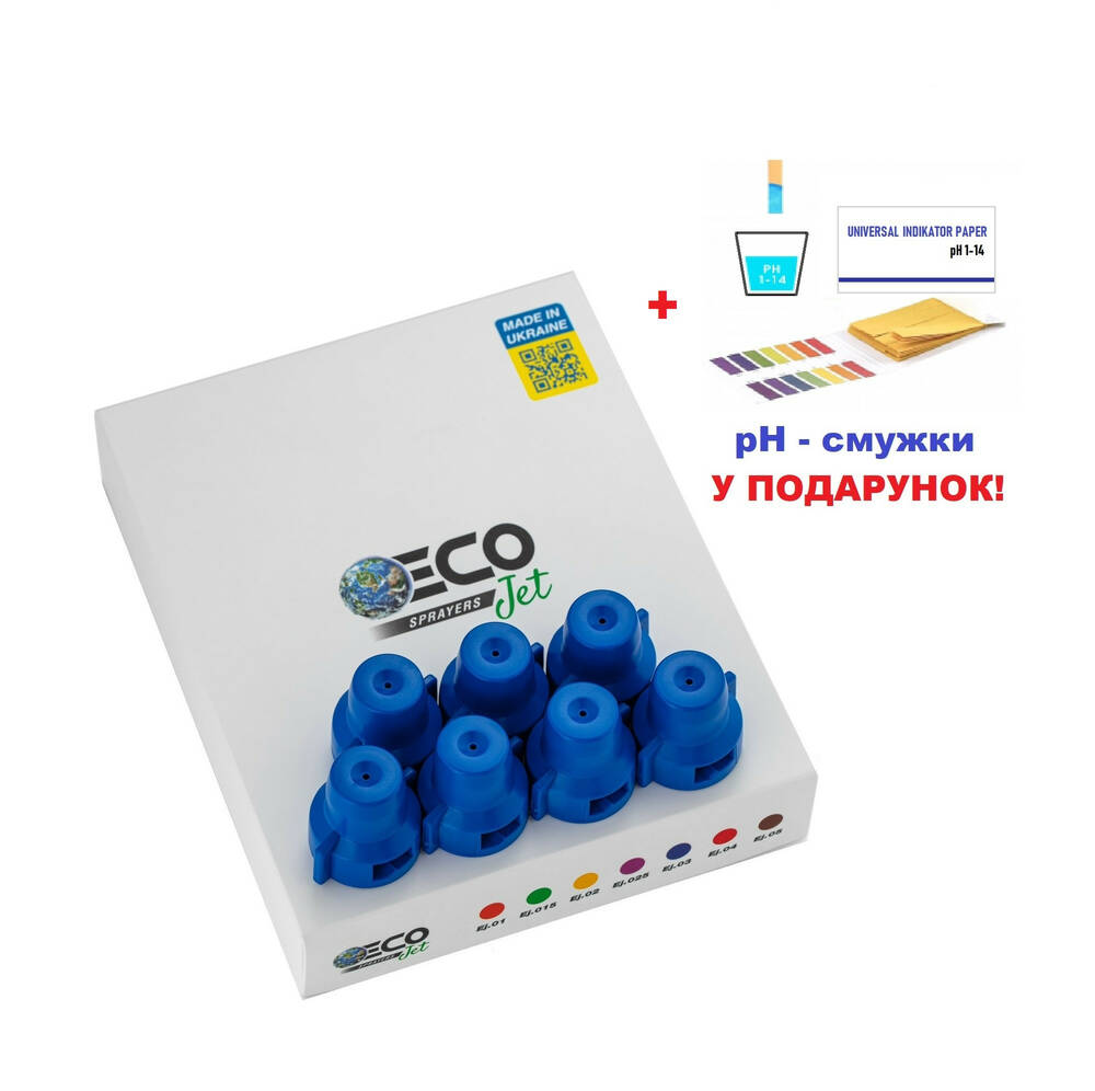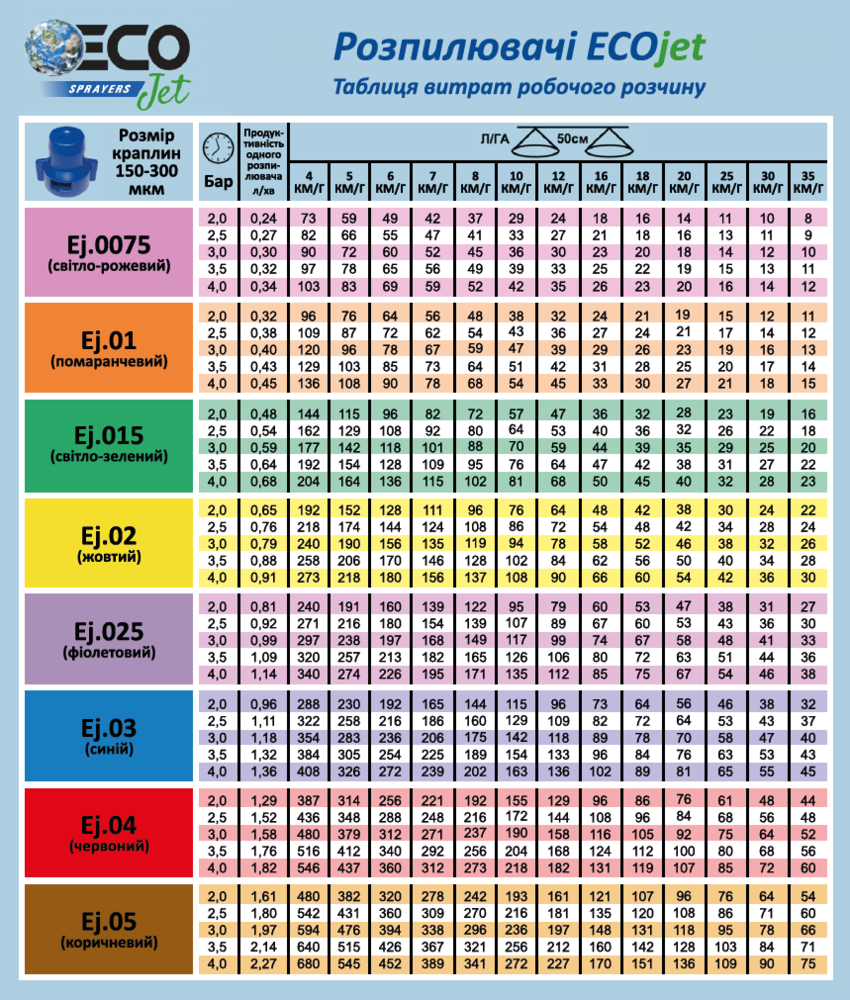 Відцентрові розпилювачі ECOjet створюють 90º конусну модель розпилення з дрібним розміром крапель і примусовим осадженням робочої рідини на поверхню рослини. Ці розпилювачі ідеально підходять для роботи на навісних, причіпних і самохідних обприскувачах за всіма видами с/г культур. Дрібний розмір крапель, краще проникнення в густу масу рослини і рівномірне покриття листя більш ніж на 80% робить цей розпилювач ідеальним інструментом для внесення інсектицидів, фунгіцидів, листових добрив та інших ЗЗР.