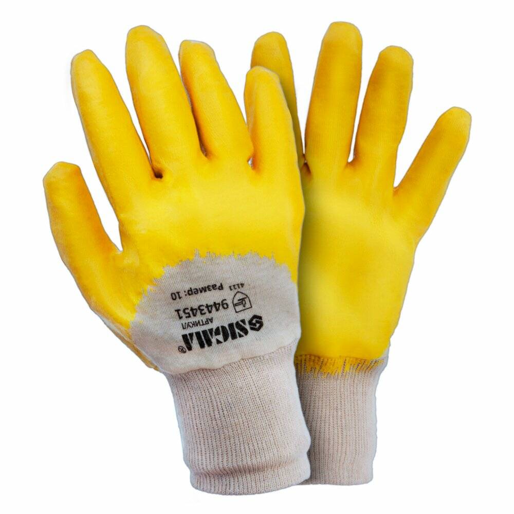 Рукавички трикотажні з нітриловим покриттям (жовті) SIGMA (9443441) призначені для захисту рук від впливів масел, жирів, нафтопродуктів, а також механічних впливів.
