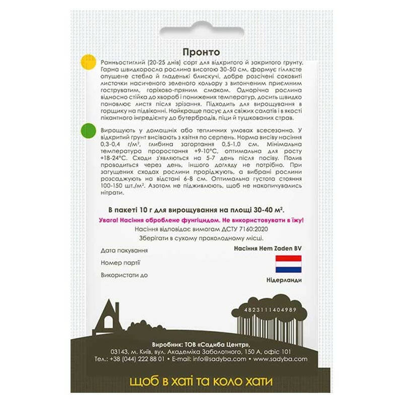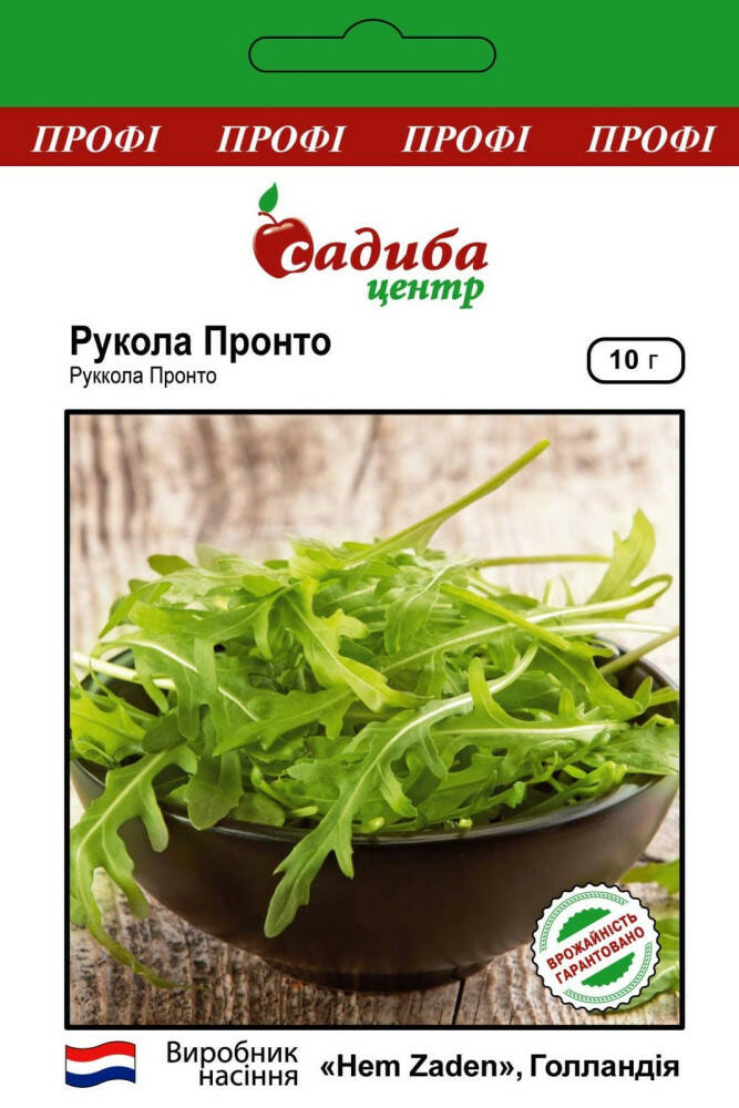 Рукола Пронто – високоврожайний сорт. Цінується за чудовий горіхово-гірчичний смак. Соковите листя - складова частина різних салатів, дрібно нарізане листя використовують при приготуванні бутербродів, це незамінний гострий гарнір до м'ясних, рибних страв. Рукола покращує обмінні процеси організму. Навіть низькокалорійна страва завдяки добавці руколи стає ситною. Також рослина – природний енергетик, імуномодулятор. Ви можете замовити насіння руколи у нашому інтернет-магазині без передоплати.