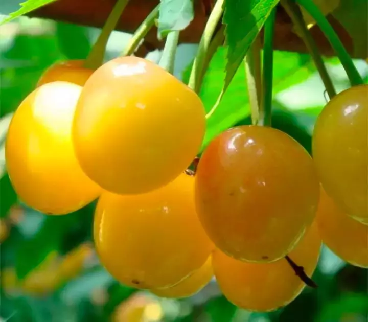 Опис Черешня жовта "Визнання" - це дерево стандартного розміру, має розкидисту крону. Листя витягнуті, з зубчастим краєм. Цвіте навесні білими квітами, що нагадують жасмин. Пора цвітіння нетривала. Ягоди мають незвичайний золотистий колір і вага до семи-десяти грам. Ростуть кистями. Форма сферична, трохи плеската. Зсередини плоди також жовті, неймовірно соковиті і дуже солодкі, з тривалим медовим післясмаком. Всередині є невелика кісточка.
