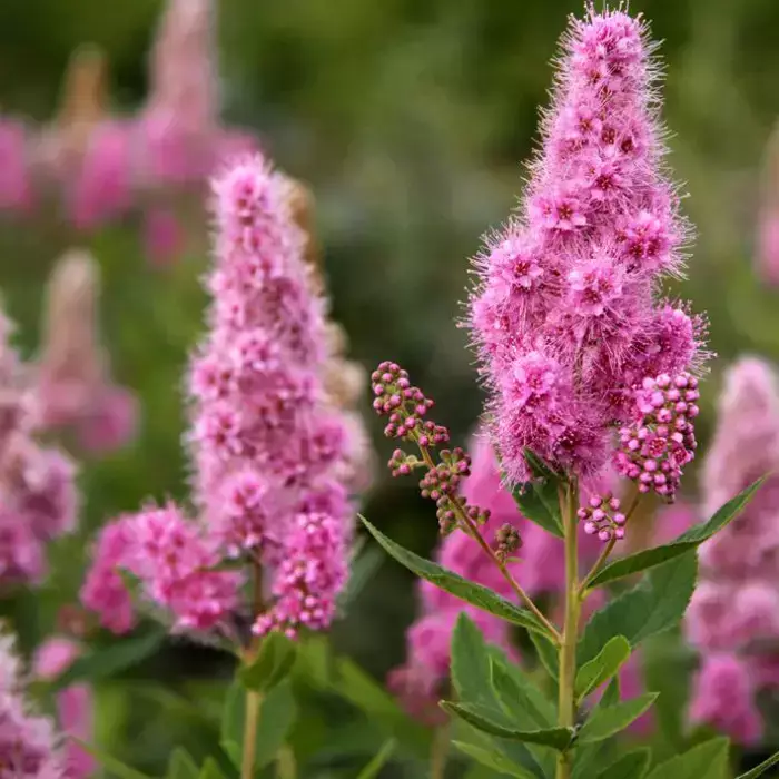 Квіти насичено-рожевого кольору, під вагою суцвіть пагони трохи відхиляються убік, утворюючи рожевий квітковий фонтан.
