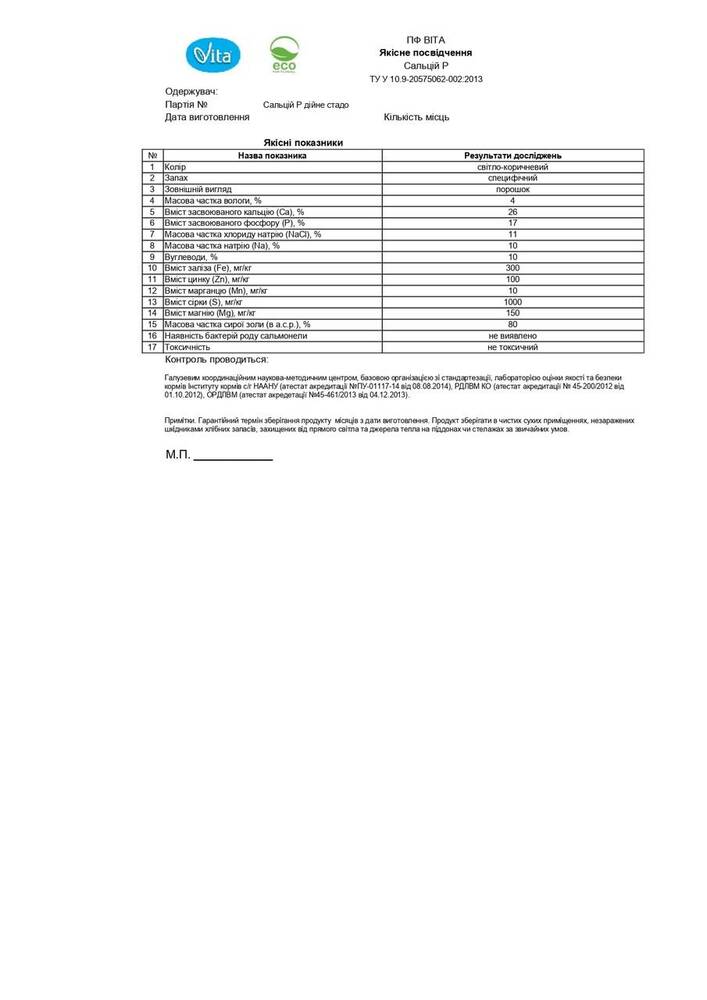 Використання Сальцій Р дозволяє повністю виключити введення трикальційфосфату, дефторованого фосфату в раціонах годівлі.