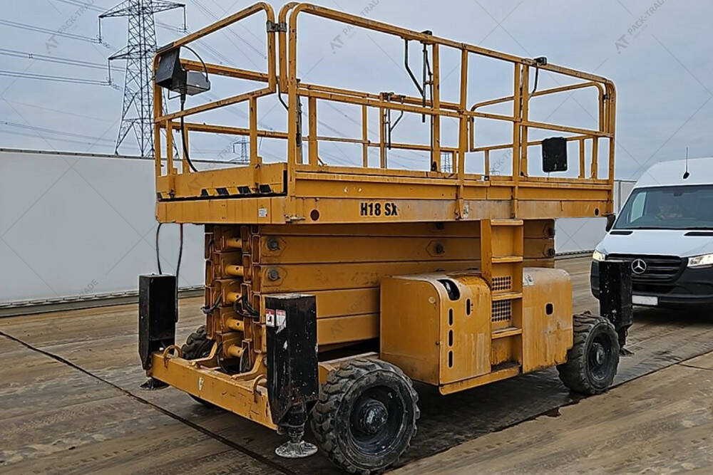 Ножичний підіймач б/в Haulotte H18SX 4x4, 2015 р/в. З напрацюванням 2683,6. Висота підйому — 18 м. Вантажопідйомність — 500 кг. Габаритна Ширина-2,2 м. Висота-2,96 м. Довжина-4,2 м.Тип двигуна Дизель, потужність 23,1 кВт. Тип щогли Ножнична. Шини: 10х16,5.