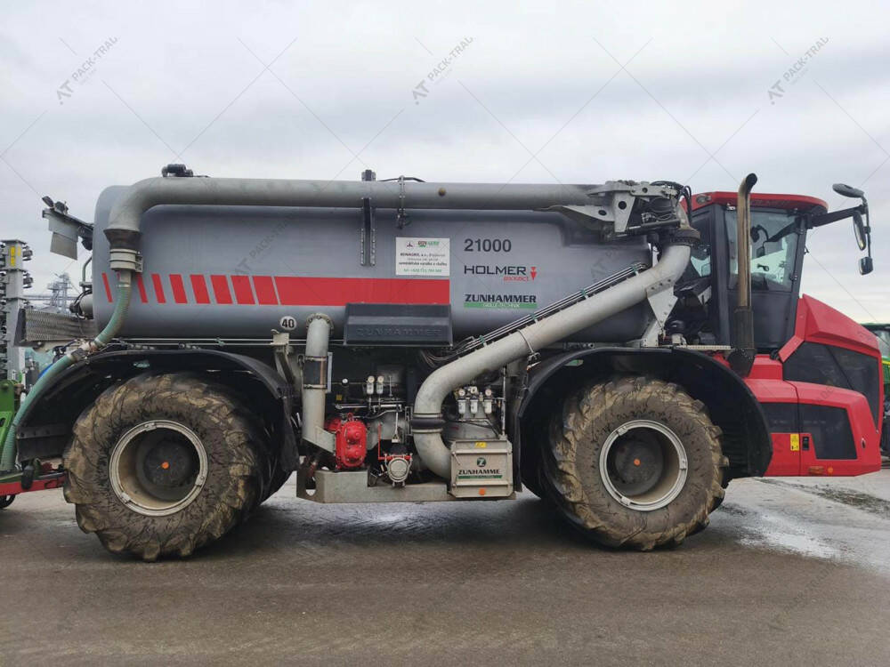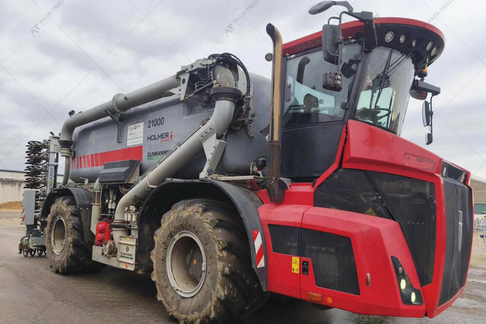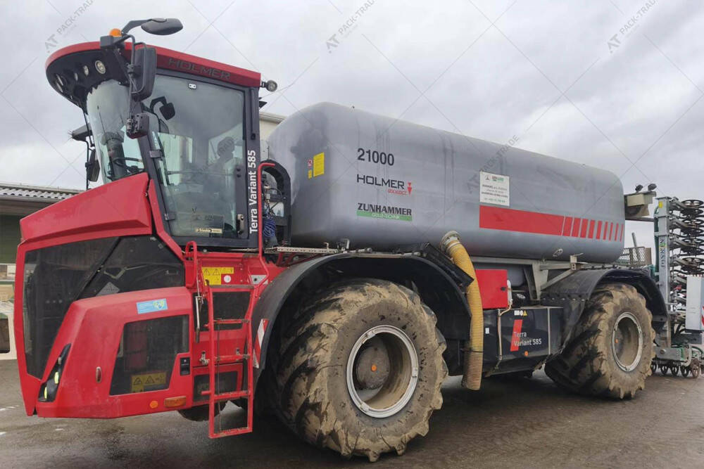 Самохідний розкидач рідких добрив б/в Holmer Terra Variant TV 585 2019 р.— це потужний самохідний системний носій, оснащений двигуном Mercedes-Benz OM 473 LA (15,6 л, 585 к.с./430 кВт) та трансмісією Funk DF 500 Powershift (18/6 передач). Машина призначена для внесення рідких органічних добрив і обладнана системою для внесення рідких добрив Zunhammer з роторним насосом продуктивністю 9000 л/хв. Для точного та ефективного виконання робіт встановлена система навігації John Deere з контролером, що підтримує функцію диференційованого внесення. Самохідний носій має постійний повний привід, розвиває швидкість до 40 км/год, використовує режим «крабового ходу» для мінімального впливу на ґрунт та забезпечує крутний момент 2750 Нм. Варіативність шин: Terra tires 1050/50 R32, CerexBib IF 1000/55 R32 CFO, 800/65 R32. Наявна система автоматичного реверсування вентилятора.
