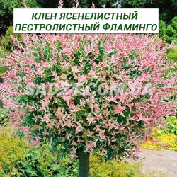 Клен ясенелистний ряболистий Фламінго - щеплений на штамбі 1,6 - 2 метри. Дуже красиве декоративне плакуче дерево з невеликою щільною кулястою кроною. Досягає 5-7 метрів заввишки. Примітна особливість обрамлене сріблясто-сіре листя з рожевим або білим мармуровим малюнком. Дуже красивий ряболистий сорт. Тіневитривалість, досить вимогливий до грунту. не підходять бідні, піщані та кислі субстрати. Відмінно витримує міські умови, вітростійкий.