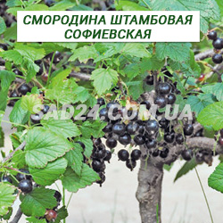 Чорна смородина на штамбі Софіївська - щеплений на штамбі близько 50 см. Відмінний сорт смородини середнього терміну дозрівання, з високою стійкістю до захворювань , гарною, регулярною врожайністю. Селекція відомого селекціонера К. Н. Копаня. Сорт отриманий внаслідок схрещування Білоруська солодка із гібридною формою С-106. Плоди великі, середньою масою 2 – 2.5 гр. округлої форми, з блиском, при повному дозріванні не обсипаються. М'якуш приємного смаку з кислинкою, дуже високих смакових якостей. Висока морозостійкість.