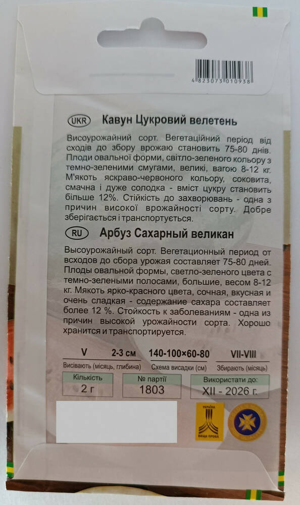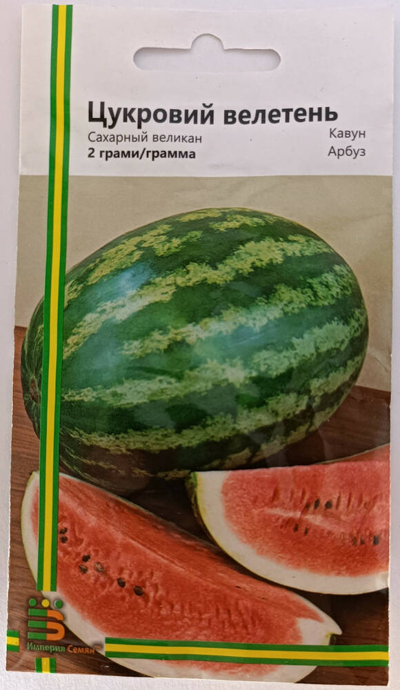 Высоурожайный сорт. Вегетационный период от всходов до сбора урожая составляет 75-80 дней. Плоды овальной формы, светло-зеленого цвета с темно-зелеными полосами, большие, весом 8-12 кг. Мякоть ярко-красного цвета, сочная, вкусная и очень сладкая - содержание сахара составляет более 12 %. Стойкость к заболеваниям - одна из причин высокой урожайности сорта. Хорошо хранится и транспортируется.