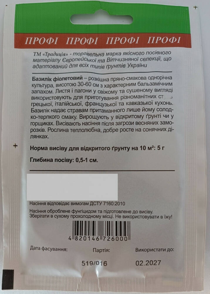 Роскошная пряно-вкусовая однолетняя культура, высотой 30-60 см с характерным бальзамическим запахом. Листья и побеги в свежем и сушеном виде используют для приготовления разнообразных блюд греческой, итальянской, французской и кавказской кухонь. Базилик придает блюдам присущий только ему сладко-терпкий вкус. Выращивают в открытом грунте или в горшках. Высевают семена после угрозы весенних заморозков. Растение теплолюбивое, хорошо растет на солнечных участках.