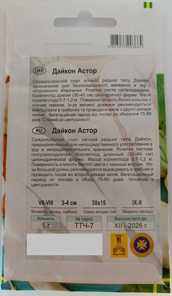 Среднеранний сорт летней редьки типа Дайкон, предназначенный для непосредственного употребления в еду и непродолжительного хранения. Розетка листьев полуприподнятая. Корнеплод длинный (30-40 см) цилиндрической формы. Масса корнеплода 0,7-1,2 кг. Поверхность и мякоть белого цвета с нежным вкусом. Из-за большой длины рекомендуется выращивать в гребнях и проводить посев во второй декаде июля. Рекомендовано расстояние между растениями 30×15 см. Вегетационный период от посева к сбору 75-85 дней. Устойчив к цветушности.