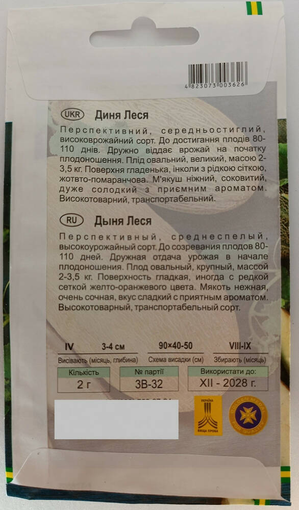 Перспективный, среднеспелый, высокоурожайный сорт. До созревания плодов 80-110 дней. Дружная отдача урожая в начале плодоношения. Плод овальный, крупный, массой 2-3,5 кг. Поверхность гладкая, иногда с редкой сеткой желто-оранжевого цвета. Мякоть нежная, очень сочная, вкус сладкий с приятным ароматом. Высокотоварный, транспортабельный сорт.