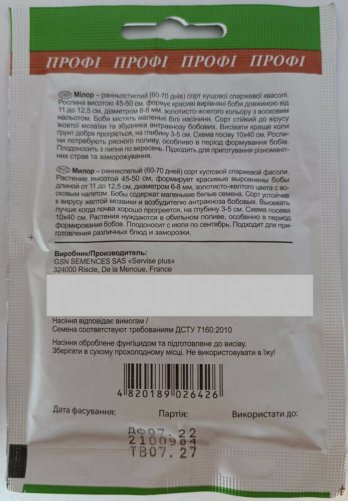 Семена фасоли Милор Садыба центр Service plus Франция 20 г