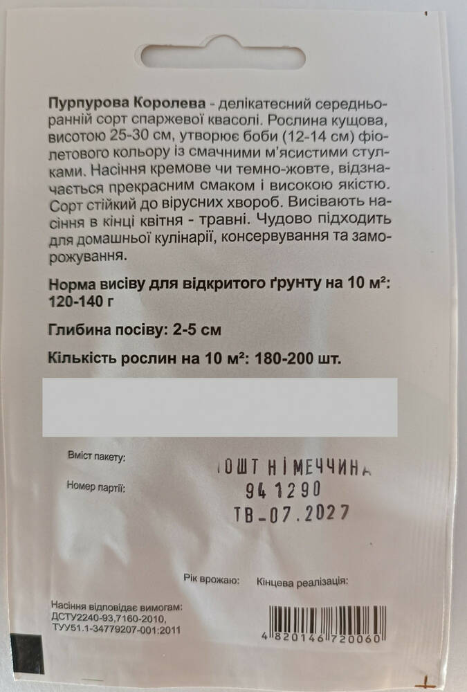 Семена фасоли Пурпурная королева Садыба центр Германия 10 шт
