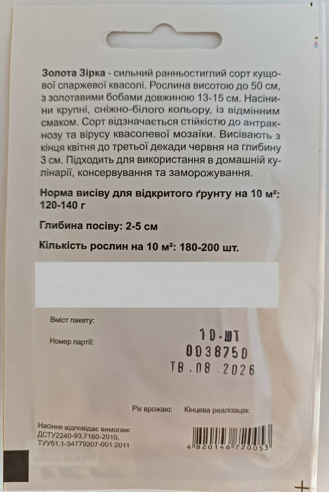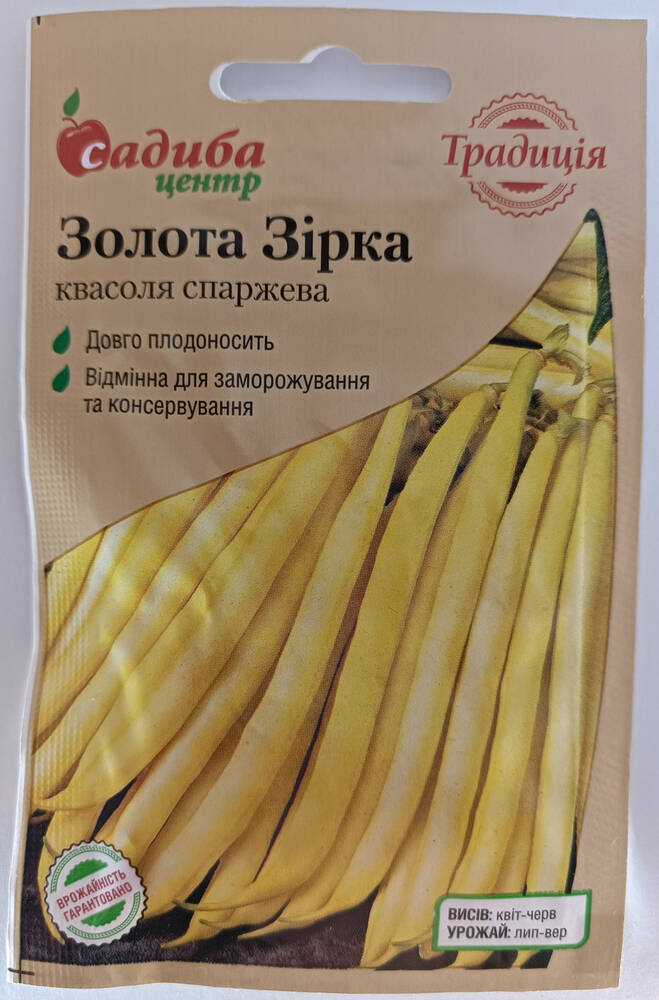 Сильный раннеспелый сорт кустовой спаржевой фасоли. Растение высотой до 50 см, с золотистыми бобами длиной 13-15 см. Семена крупные, снежно-белого цвета, с отличным вкусом. Сорт отличается стойкостью к антракнозу и вирусу фасолевой мозаики. Высевают с конца апреля до третьей декады июня на глубину 3 см. Подходит для использования в домашней кулинарии, консервировании и замораживании.