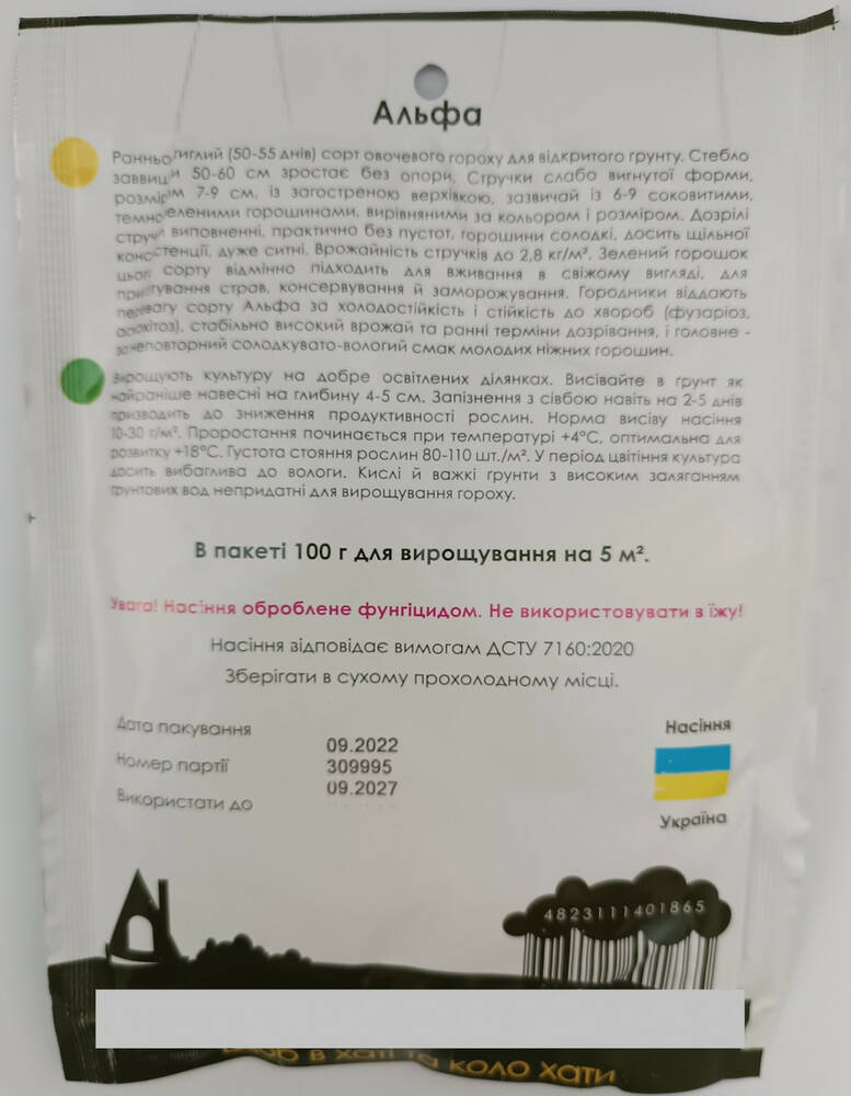 Раннеспелый (50-55 дней) сорт овощного гороха для открытого грунта. Стебель высотой 50-60 см растет без опоры. Стручки слабо изогнутой формы размером 7-9 см с заостренной верхушкой, обычно с 5-9 сочными, темно-зелеными горошинами, выровненными по цвету и размеру. Созревшие стручки наполнены, практически без пустот, горошины сладкие, достаточно плотной консистенции, очень сытные. Урожайность стручков до 2,8 кг/м2. Зеленый горошек этого сорта отлично подходит для употребления в свежем виде, для приготовления блюд, консервирования и замораживания. Огородники предпочитают сорт Альфа за холодостойкость и устойчивость к заболеваниям (фузариоз, аскохитоз), стабильно высокий урожай и ранние сроки созревания, и главное - за неповторимый сладковато-влажный вкус молодых нежных горошин.