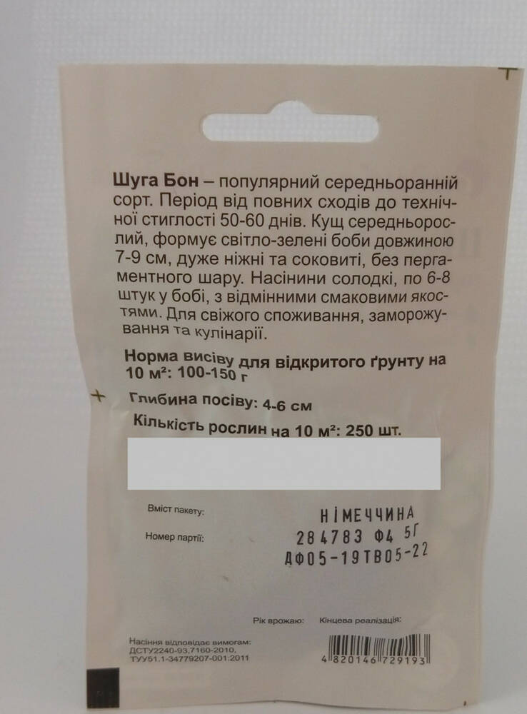 Шугар Бон - популярный среднеранний сорт. Период от полных всходов до технической спелости 50-60 дней. Куст среднерослый, формирует светло-зеленые бобы длиной 7-9 см, очень нежные и сочные, без пергаментного слоя. Семена сладкие, по 6-8 штук в бобе, с отличными вкусовыми качествами. Для свежего потребления, замораживание и кулинарии.