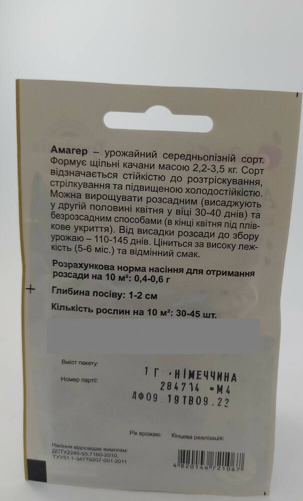 Семена капусты Амагер Садыба центр Германия 1 г