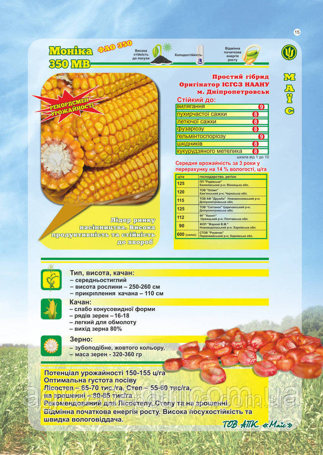 Характеризуется хорошим стартовым ростом на начальных фазах развития растения. Высота растения 250-260 см. Высота прикрепления початка – 110 см. Початок конусной формы, рядов зерен: 16-18. Легок для обмолота. Выход зерна 80%. Зерно зубовидное, желтого цвета. Масса 1000 зерен – 320-360г.