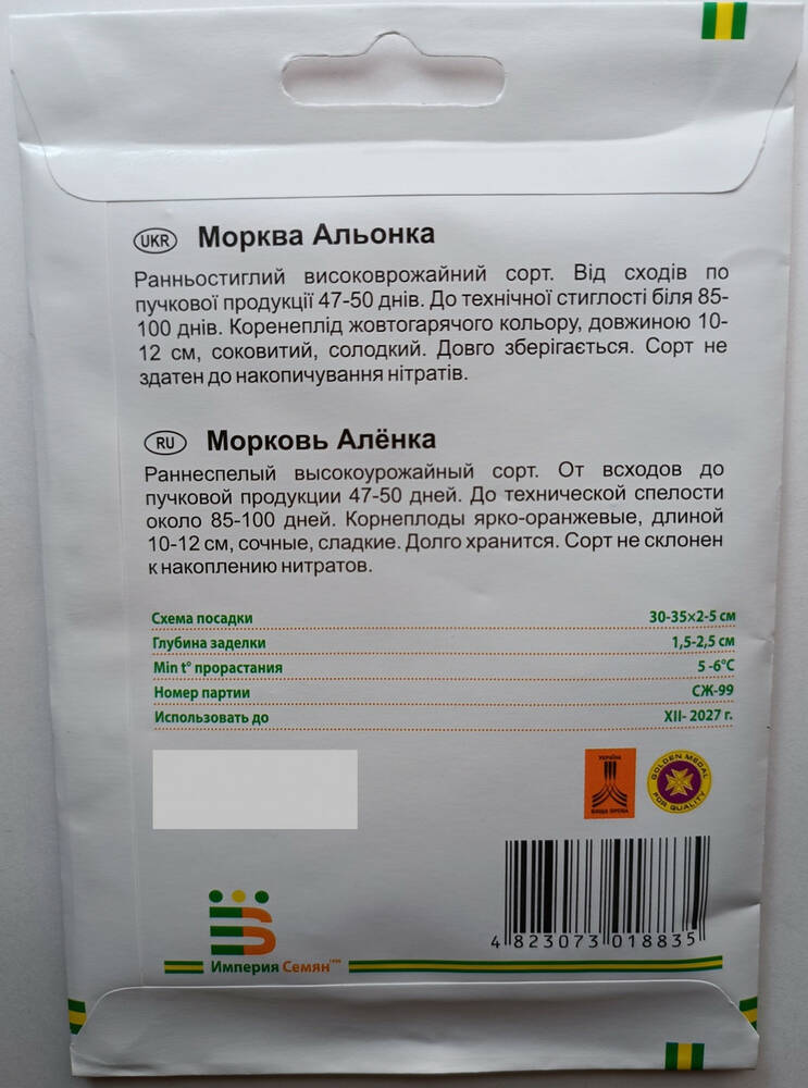 Раннеспелый высокоурожайный сорт. От всходов до пучковой продукции 47-50 дней. До технической спелости около 85-100 дней. Корнеплоды ярко-оранжевые, длиной 10-12 см, сочные, сладкие. Долго хранится. Сорт не склонен к накоплению нитратов.