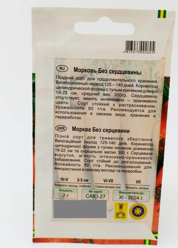 Поздний сорт для продолжительного хранения. Вегетационный период 125-140 дней. Корнеплод цилиндрической формы с тупым кончиком длиной 19-22 см, средний вес 300гр. Сердцевина отсутствует, мякоть интенсивно - оранжевого цвета. Сорт стойкий к растрескиванию. Урожайность 80 т/га. Рекомендуется для использования в свежем виде, хранения и переработки.