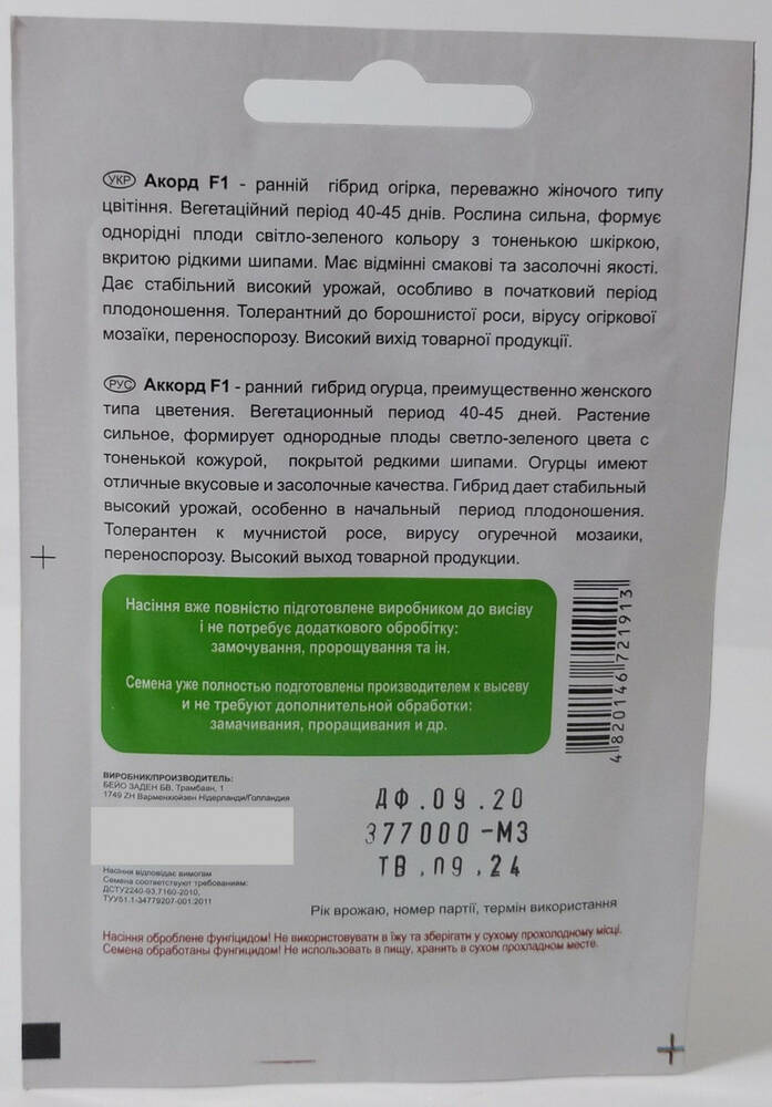 Ранний гибрид огурца, преимущественно женского цветения. Вегетационный период 40-45 дней. Растение сильное, формирует однородные плоды светло-зеленого цвета с тоненькой кожурой, покрытой жидкими шипами. Огурцы обладают отличными вкусовыми и засолочными качествами. Гибрид дает стабильный высокий урожай, особенно в начальном периоде плодоношения. Толерантен к мучнистой росе, вирусу огуречной мозаики, переносу пороза. Высокий выход товарной продукции.