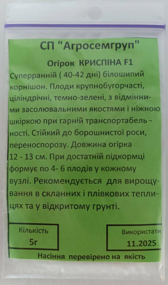Суперраний (40-42 дня) белошипый корнишон. Плоды крупнобугорчатые, цилиндрические, темно-зеленые, с отличными засолочными качествами и нежной кожурой при хорошей транспортабельности. Устойчив к мучнистой росе, переносу пороза. Длина огурца 12-13 см. При достаточной подкормке формирует по 4-6 плодов в каждом узле. Рекомендуется для выращивания в стеклянных и пленочных теплицах и в открытом грунте.