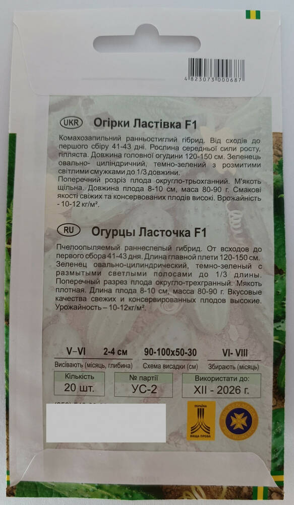 Пчелоопыляемый раннеспелый гибрид. От всходов до первого сбора 41-43 дня. Длина главной плети 120-150 см. Зеленец овально-цилиндрический, темно-зеленый с размытыми светлыми полосами до 1/3 длины. Поперечный разрез плода округло-трехгранный. Мякоть плотная. Длина плода 8-10 см, масса 80-90 г. Вкусовые качества свежих и консервированных плодов высокие. Урожайность – 10-12кг/м².
