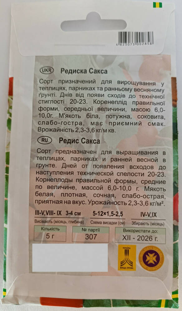 Сорт предназначен для выращивания в теплицах, парниках и ранней весной в грунте. Сорт ранний. Дней от появления всходов до наступления технической спелости 20-23. Корнеплоды правильной формы, средние по величине, массой 6-10 г. Мякоть белая, плотная, сочная, слабо-острая, приятная на вкус. Урожайность 2,3-3,6 кг/м2.