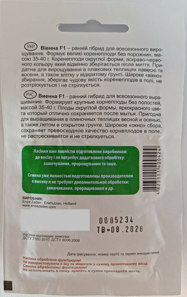 Ранний гибрид для всесезонного выращивания. Формирует крупные корнеплоды без полостей, массой 35-40 г. Корнеплоды округлой формы, алого цвета отлично сохраняется после мытья. Широкое «окно» уборки, сохраняющее превосходное качество корнеплодов в поле, не растрескивается и не стреляется.