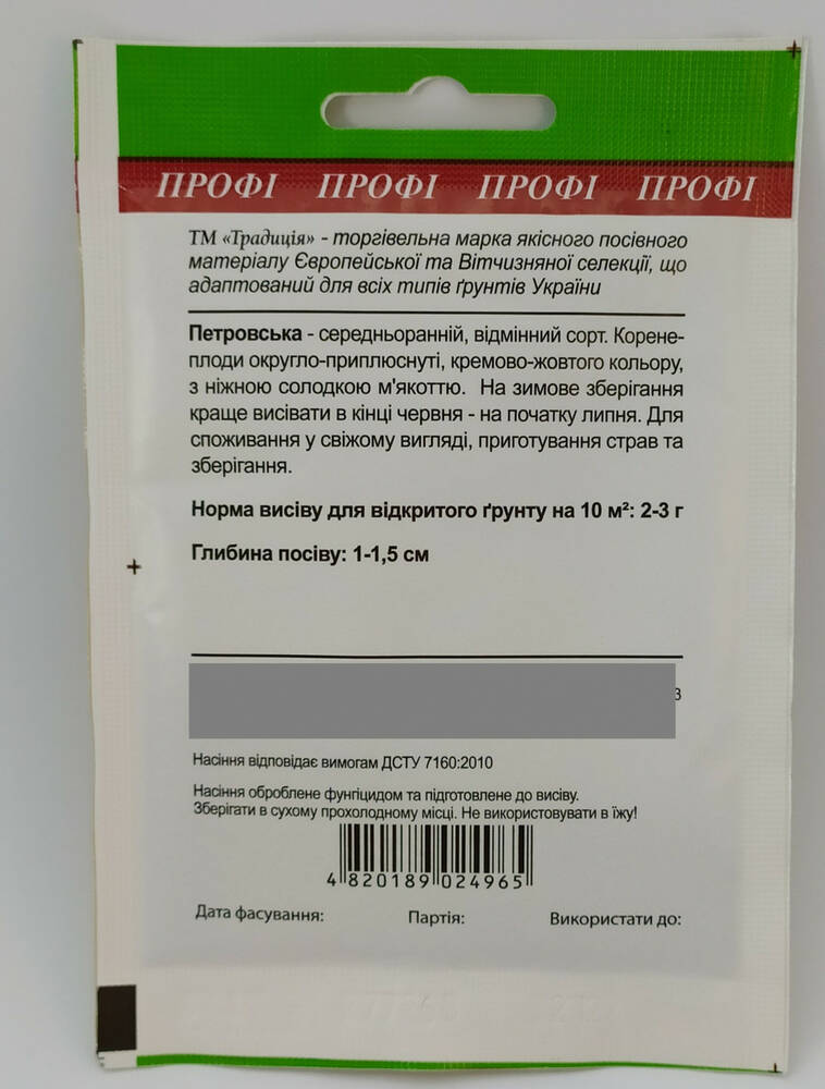 Среднеранний, отличный сорт. Созревает через 60-84 дня после посадки. Корнеплоды округло-приплюснутые, кремово-желтого цвета, с нежной сладкой мякотью. На зимнее хранение лучше высевать в конце июня – начале июля. Для употребления в свежем виде, приготовления блюд и хранения. Норма высева для открытого грунта на 10 м2: 2-3 г. Глубина посева: 1-1,5 см.