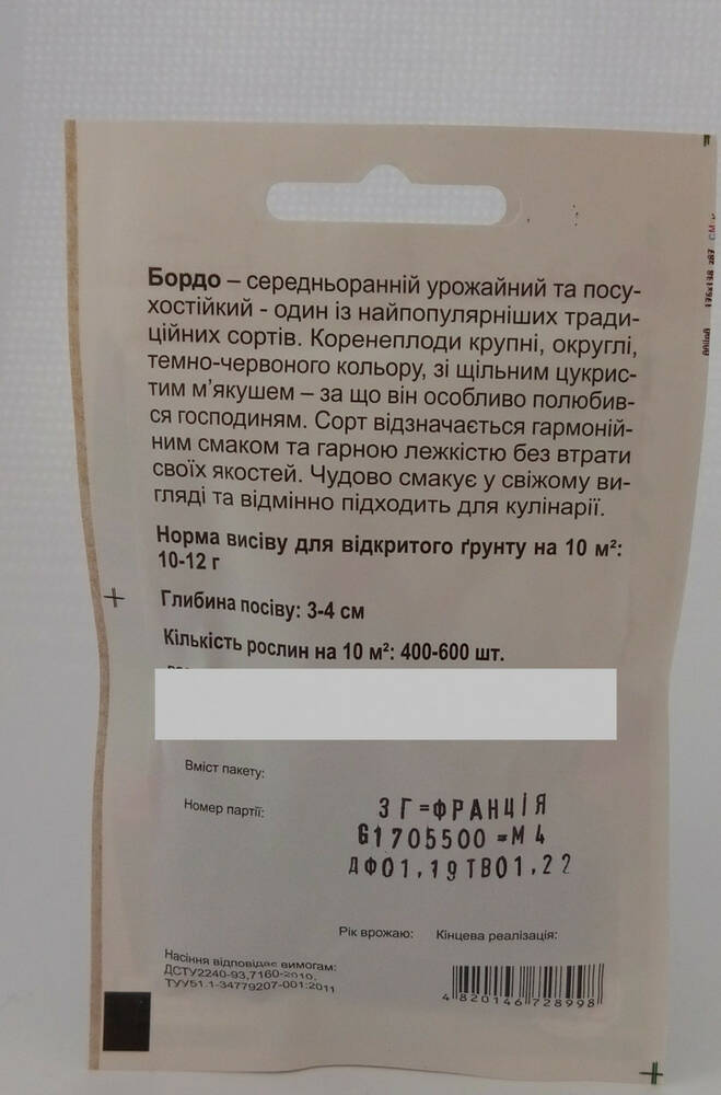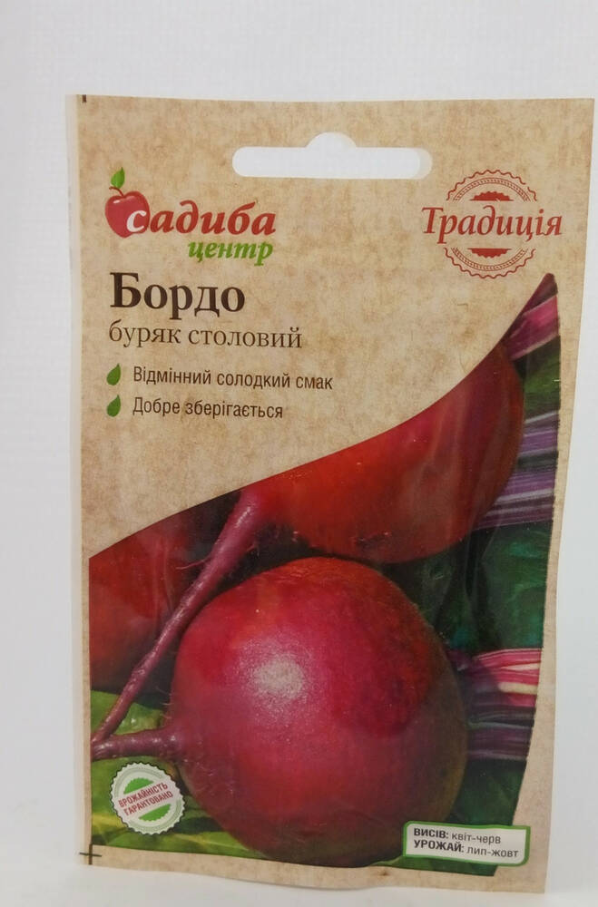 Бордо - среднеранний урожайный и засухоустойчивый - один из самых популярных традиционных сортов. Корнеплоды крупные, округлые, темно-красного цвета, с плотным сахаристым мякотью - за что он особенно полюбился хозяйкам. Сорт отличается гармоничным вкусом и хорошей лежкостью без потери своих качеств. Прекрасно сочетается в свежем виде и отлично подходит для кулинарии. Норма высева для открытого грунта на 10 м: 10-12 г. Глубина посева 3-4 см. Количество растений на 10 м: 400-600 шт.