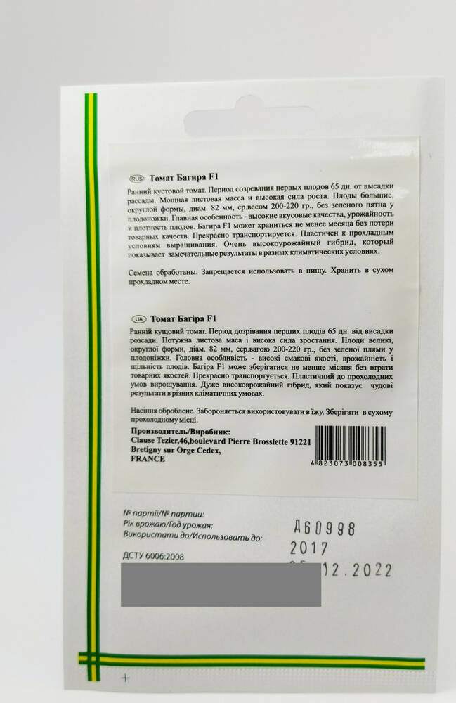 Ранний кустовой томат. Период созревания первых плодов 65 дн. от высадки рассады. Мощная листовая масса и высокая сила роста. Плоды большие, округлой формы, диам. 82 мм, ср.вес 200-220 гр., без зеленого пятна у плодоножки. Главная особенность - высокие вкусовые качества, урожайность и плотность плодов. Багира F1 может храниться не менее месяца без потери товарных качеств. Прекрасно транспортируется. Пластичен к прохладным условиям выращивания. Очень высокоурожайный гибрид, который показывает замечательные результаты.