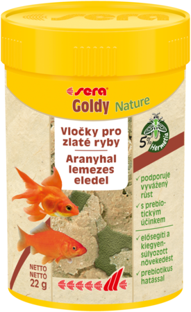sera Goldy Nature - пластівці для здорового росту і приголомшливого кольору золотих риб, є основним кормом для невеликих золотих рибок та їх видів, таких як шубункіни, вуалехвости, комети а також інших холодноводних риб, що не містять барвників та консервантів.