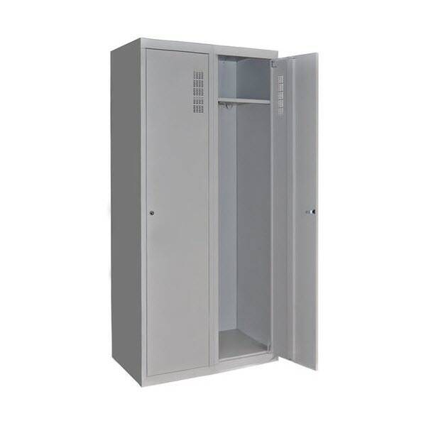 Модель складається з двох секцій — лівої та правої. Кожна секція обладнана двома полицями (для головних уборів і взуття) та гачками для розвішування халатів, комбінезонів чи костюмів. Дверцята замикаються на індивідуальні ключі, що гарантує безпечне зберігання речей персоналу.