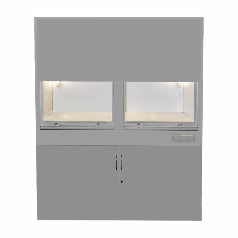 • Двосекційна будова: нижня частина оснащена металевими дверцятами для зберігання реактивів чи інструментів, верхня — з робочою камерою та скляною заслінкою для безпечної роботи.