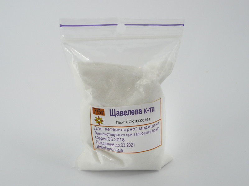 приготування 2% розчину, розчиняють 20 г щавельної кислоти в 1 літрі теплої кип'яченої води. Обробляють міжрамковий простір вуликів за допомогою обприскувача на відстані 25-30 см, під кутом 30-400 до рамок, з розрахунку 5-10 мл розчину на кожен міжрамковий простір. Обприскування проводять навесні триразово, з інтервалом 1 тиждень, і восени, після збирання меду, за температури повітря не нижче +15 0С.