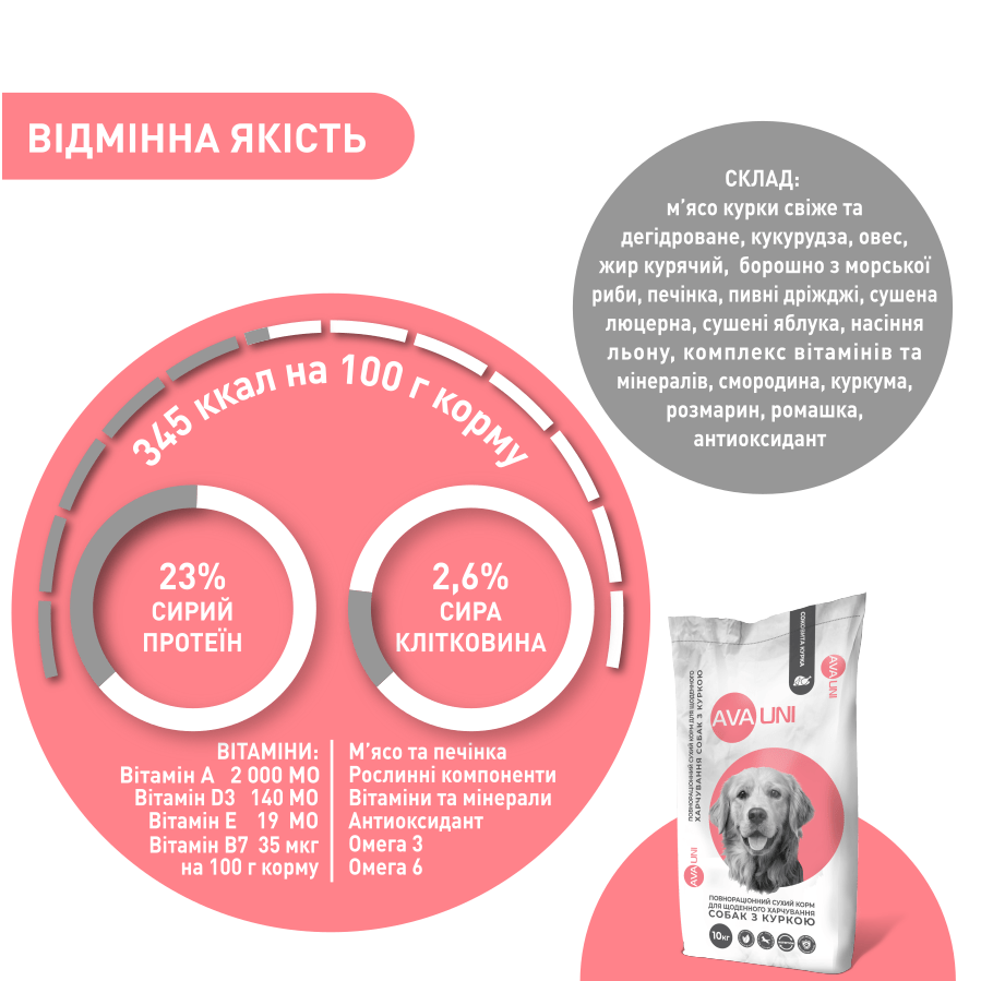Щоденний готовий корм AVA UNІ із соковитою куркою містить якісні інгредієнти корму та вміст необхідних поживних речовин, котрі підібрані згідно європейських стандартів харчування собак. Він забезпечить організм собак всім необхідним та зробить щоденне харчування повноцінним та збалансованим.