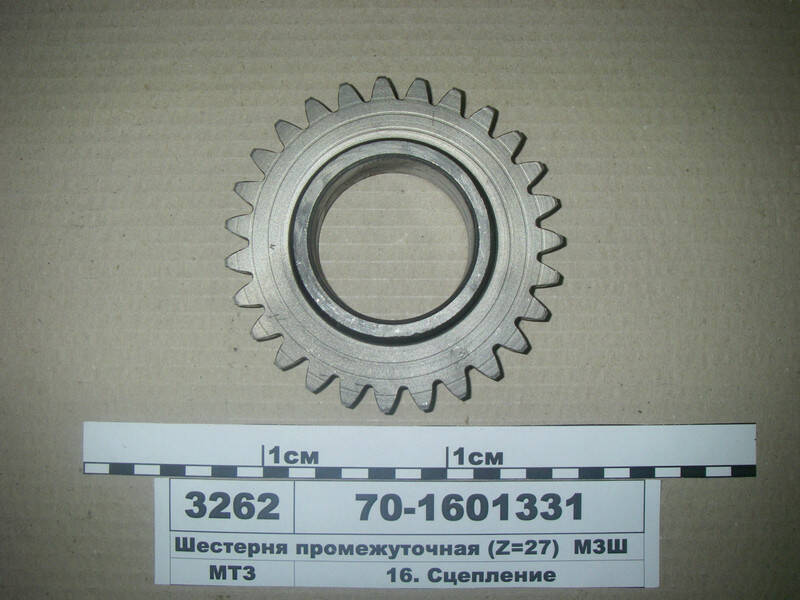 Покупая у нас вы всегда можете быть уверены в качестве приобретаемого товара! Шестерня промежуточная оси 70-1601335 Z=27 устанавливается на механических коробках передач тракторов МТЗ-80, 82, 892, 821, 921, 920, 950, оригинальная, производства ОАО 'Минский завод шестерен', ОАО 'МЗШ', г. Минск, Республика Беларусь На сайте нашего интернет магазина Вы без проблем для себя сможете подобрать интересующие Вас запчасти на грузовые авто, прицепы и полуприцепы, сельскохозяйственную технику.