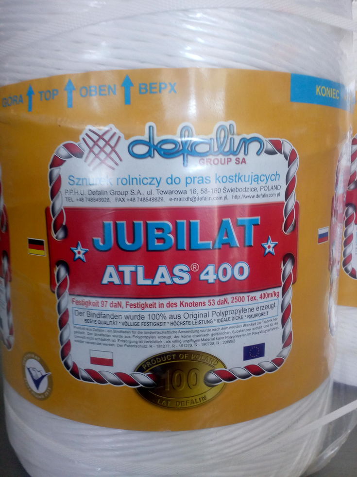Тюковочный шнур Атлас подходит к многим автоматическим и полуавтоматическим пресс-подборщикам, используется для вязки сена и соломы в тюки. Прошел проверку в роботе как на отечественных прессах, так и заграничных. Также шпагат 400 широко эксплуатируют в изготовлении разных промышленных товаров, подвязывании и упаковки.