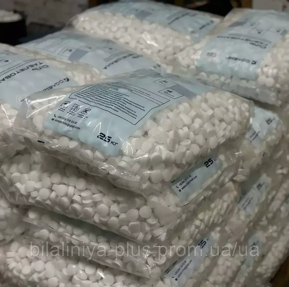 Наше підприємство виробляє таблетовану сіль європейського рівня якості, тому ми надаємо всі необхідні сертифікати.Таблетована сіль (NaCl) - спресована у вигляді таблетки та ідеально підходить для відновлення властивостей іонообмінних смол, що використовуються в різних системах очистки води.