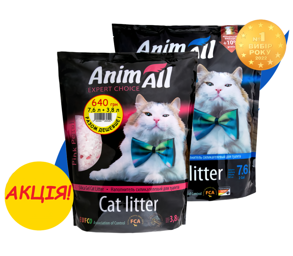 Силікагелевий наповнювач для котячого туалету AnimAll Рожеві пелюстки та Блакитний аквамарин 7.6 л + 3.8 л