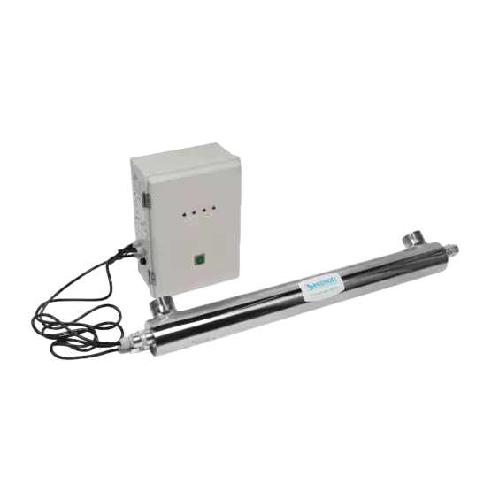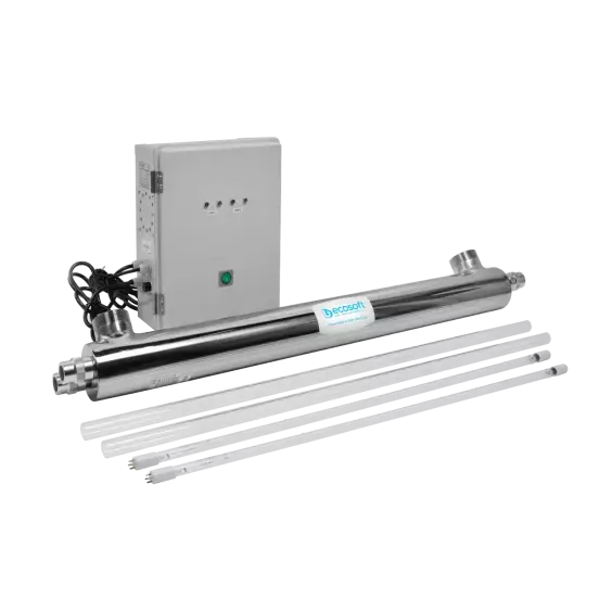 Ультрафіолетовий знезаражувач води Ecosoft EB-45 — металевий корпус, всередині якого розміщені 2 ультрафіолетові лампи в спеціальних кварцевих рукавах.